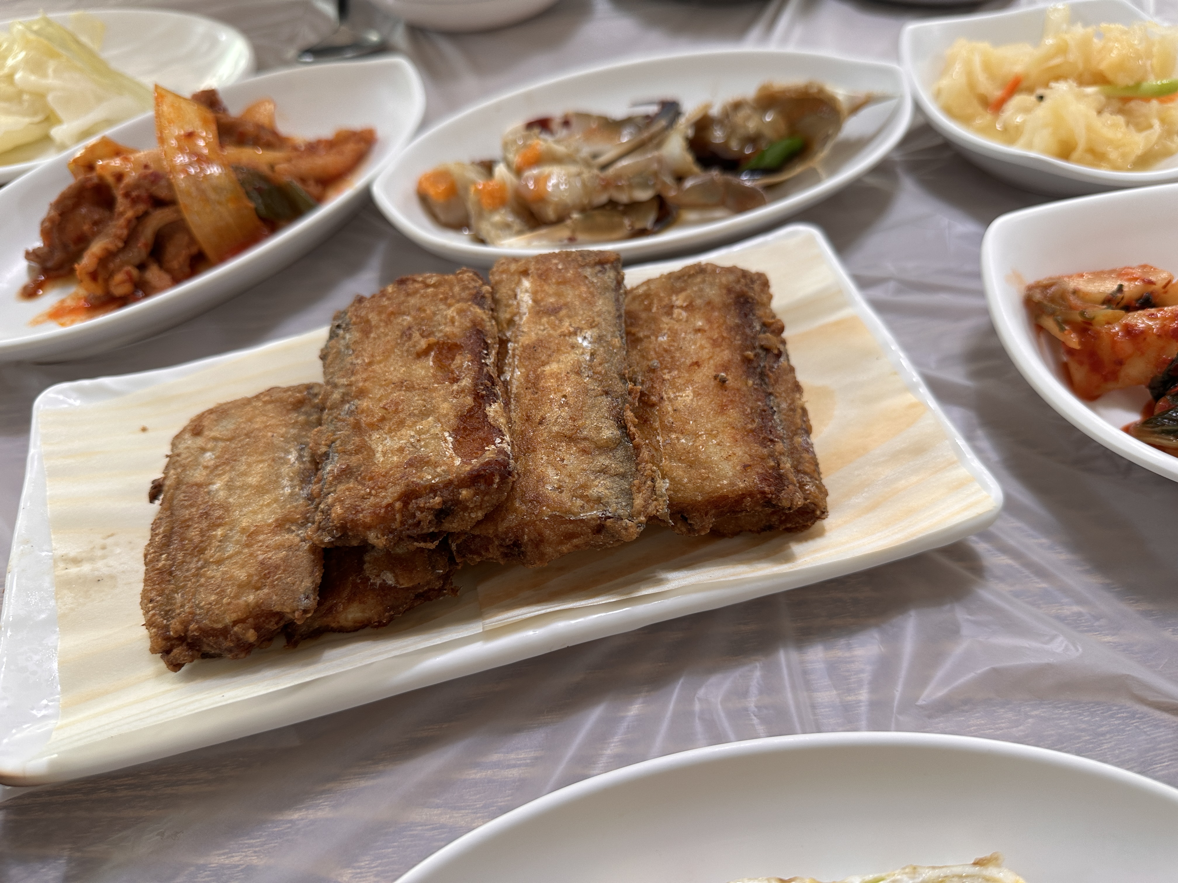 전라도밥상을 주문하면 다양한 반찬과 함께 바삭하게 튀겨낸 갈치구이가 나오는데, 갓 튀겨내어 제공되기 때문에 리필이 나오는데 시간이 걸립니다. 또한, 게장정식을 따로 주문하지 않아도 간장게장이 기본 반찬으로 제공되어 전라도 특유의 감칠맛을 느낄 수 있습니다. 반찬으로 나온 잡채는 달달한 편이었고, 다른 반찬들은 무난하면서도 깔끔한 맛이었습니다. 다만, 계란말이와 게장은 리필되지 않는 점이 아쉬웠습니다. 하지만 15000원에 갈치구이와 나머지반찬들이 무제한인 점이 너무 좋았습니다.